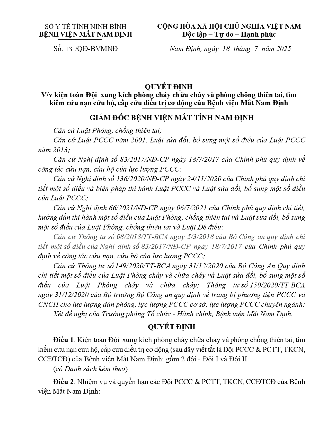 Quyết định kiện toàn đội xung kích PCCC và PCTT, TKCNCH, cấp cứu điều . . .