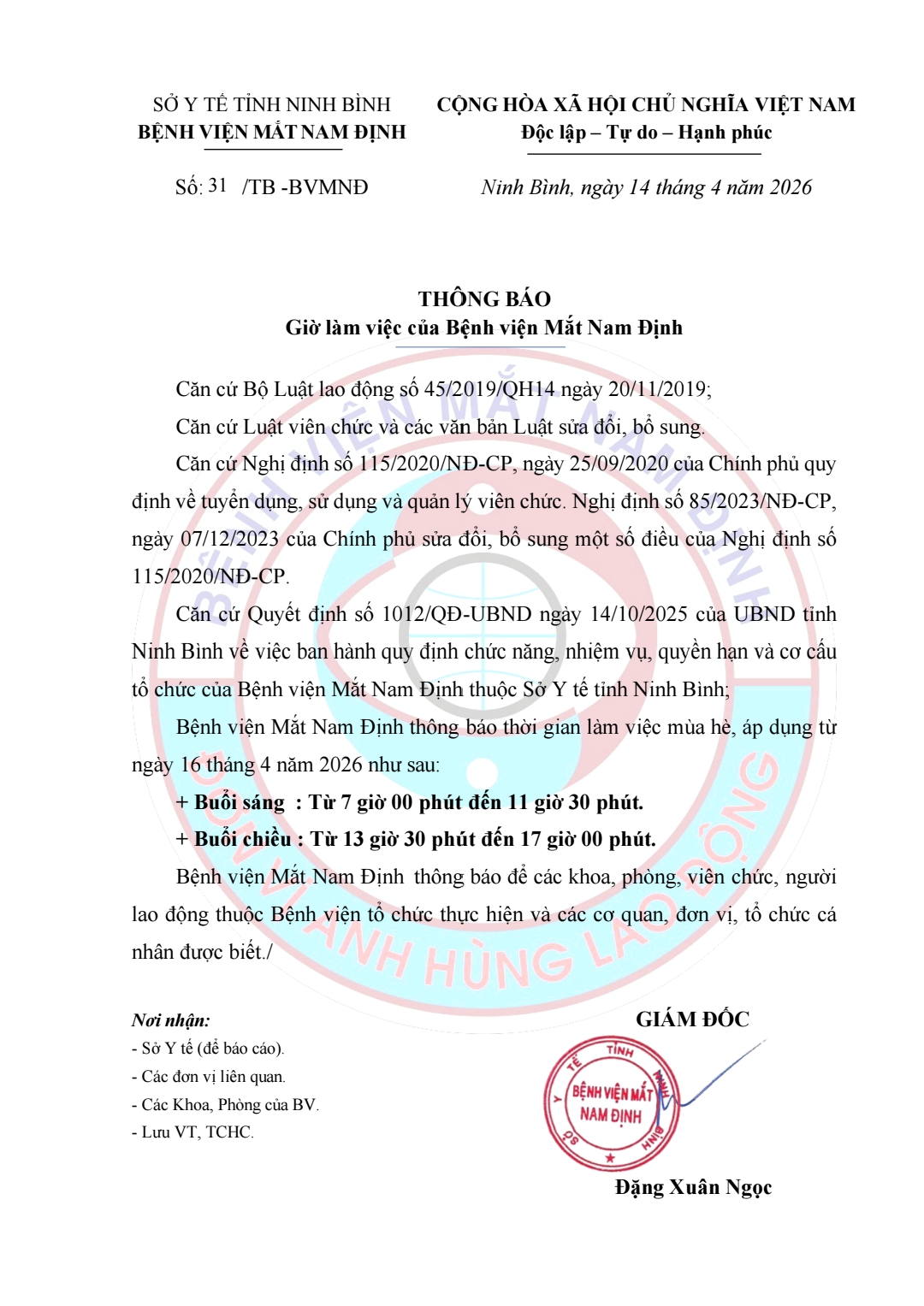 Thông báo giờ làm việc mùa hè Bệnh viện Mắt Nam Định năm 2026