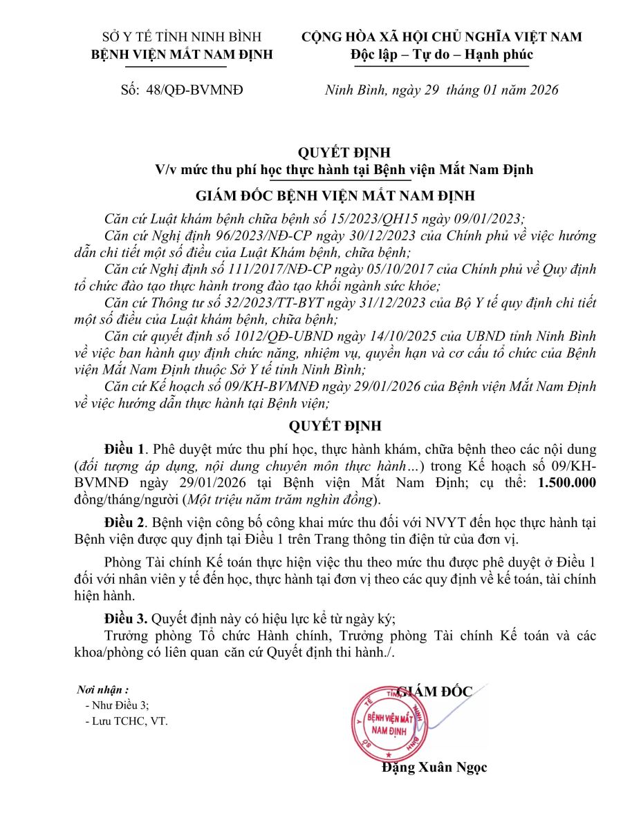 Quyết định phê duyệt mức thu phí học thực hành tại Bệnh viện Mắt Nam Định