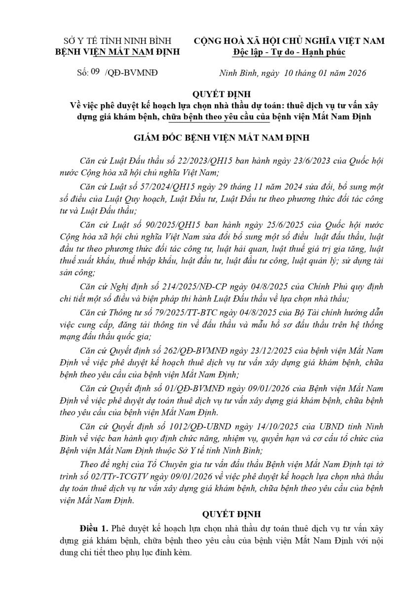 Quyết định V/v phê duyệt KHLCNT dự toán: thuê dịch vụ tư vấn xây dựng giá khám bệnh, chữa bệnh theo yêu cầu