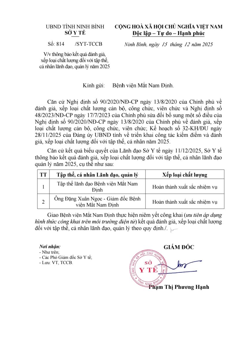 | Trang chủ   >   Hoạt động bệnh viện | | Thông báo kết quả đánh giá, xếp loại chất lượng đối với tập thể, cá nhân lãnh đạo, quản lý năm 2025 | | |