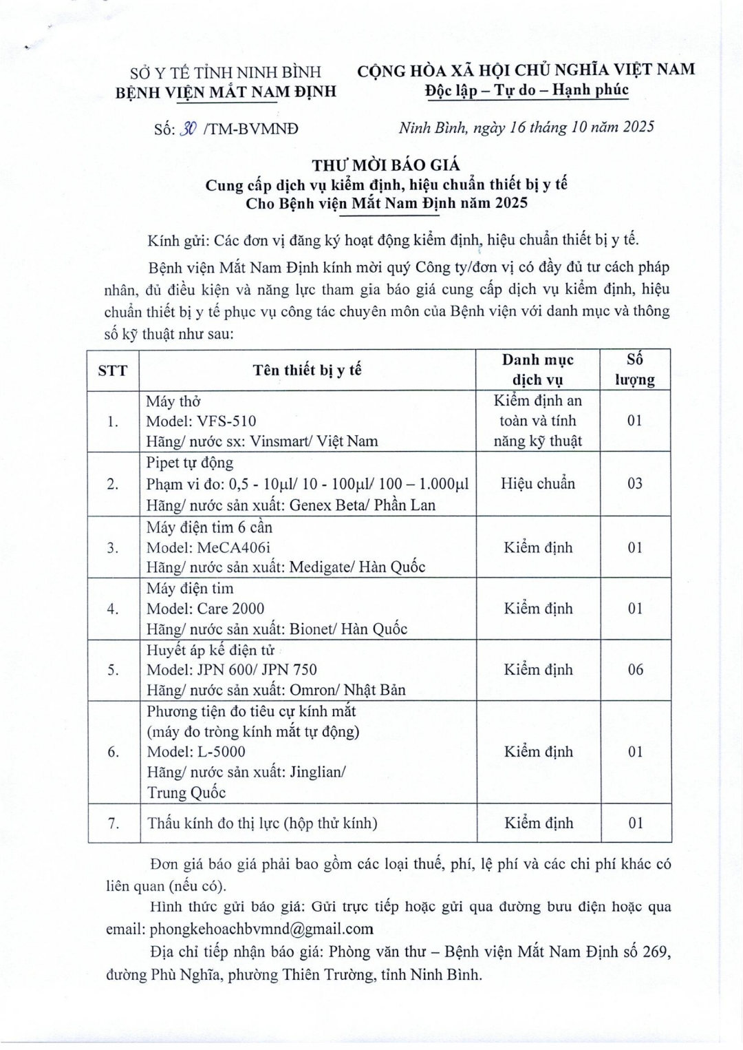 Thư mời báo giá dịch vụ kiểm định, hiệu chuẩn TBYT