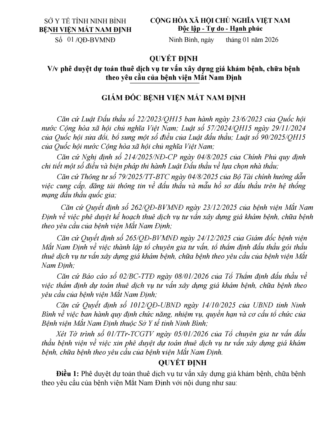 Quyết định vv Phê duyệt dự toán thuê dịch vụ tư vấn xây dựng giá khám . . .