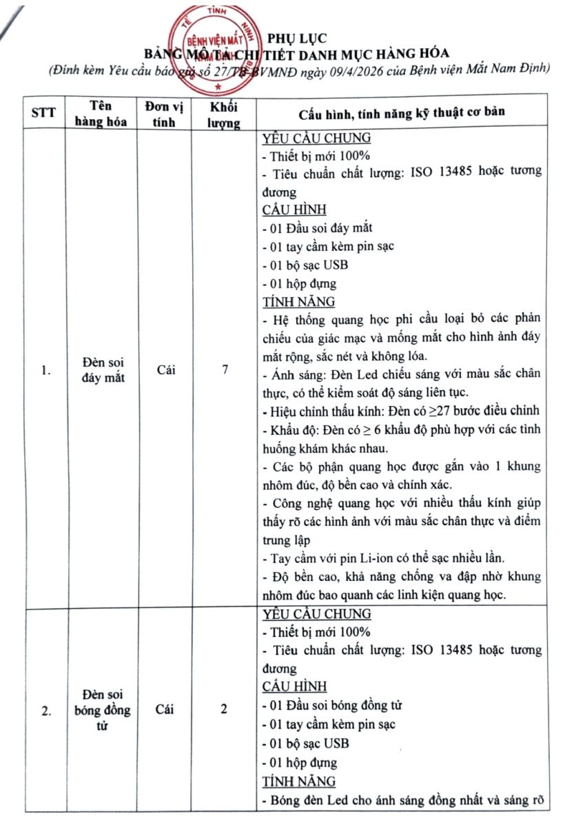 Yêu cầu báo giá thiết bị nhãn khoa phục vụ hoạt động chuyên môn của Bệnh viện Mắt Nam Định năm 2026