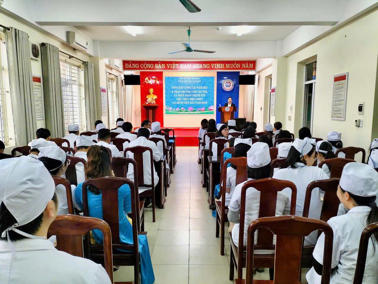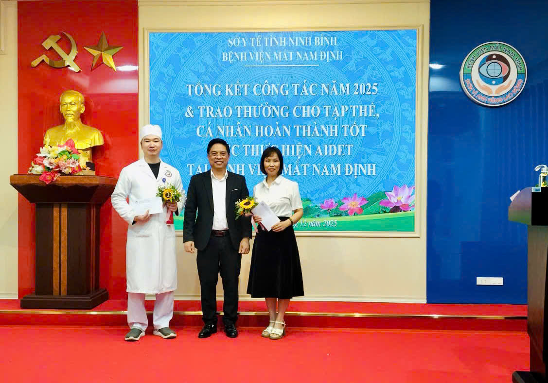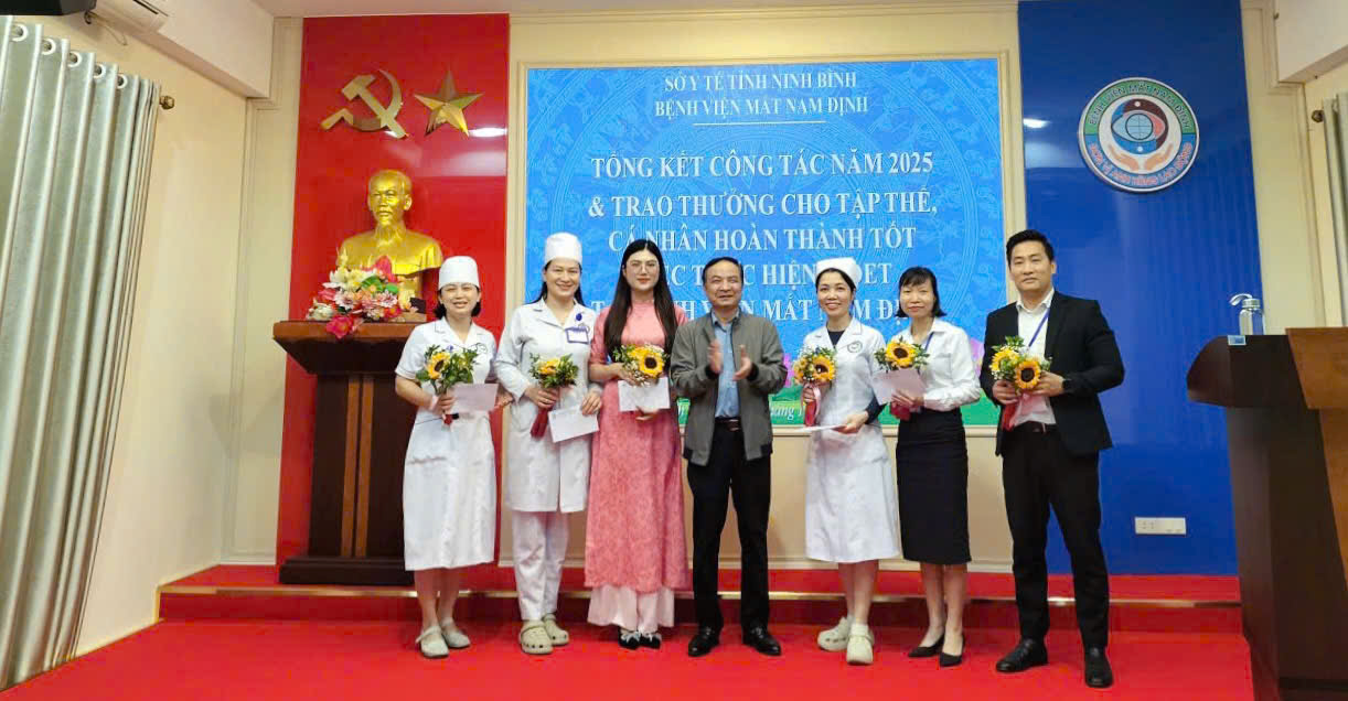 Chiều ngày 31/12/2025, Bệnh viện Mắt Nam Định đã trang trọng tổ chức Hội nghị Tổng kết công tác năm 2025 và triển khai phương hướng nhiệm vụ năm 2026. Tham dự Hội nghị Tổng kết công tác bệnh viện, có đồng chí Đặng Xuân Ngọc - Giám đốc Bệnh viện; Ban Giám đốc, Trưởng, Phó các khoa, phòng cùng toàn thể nhân viên của bệnh viện. Một trong những điểm nhấn quan trọng của hội nghị là lễ trao thưởng cho các tập thể và cá nhân có thành tích xuất sắc trong việc thực hiện mô hình giao tiếp AIDET.