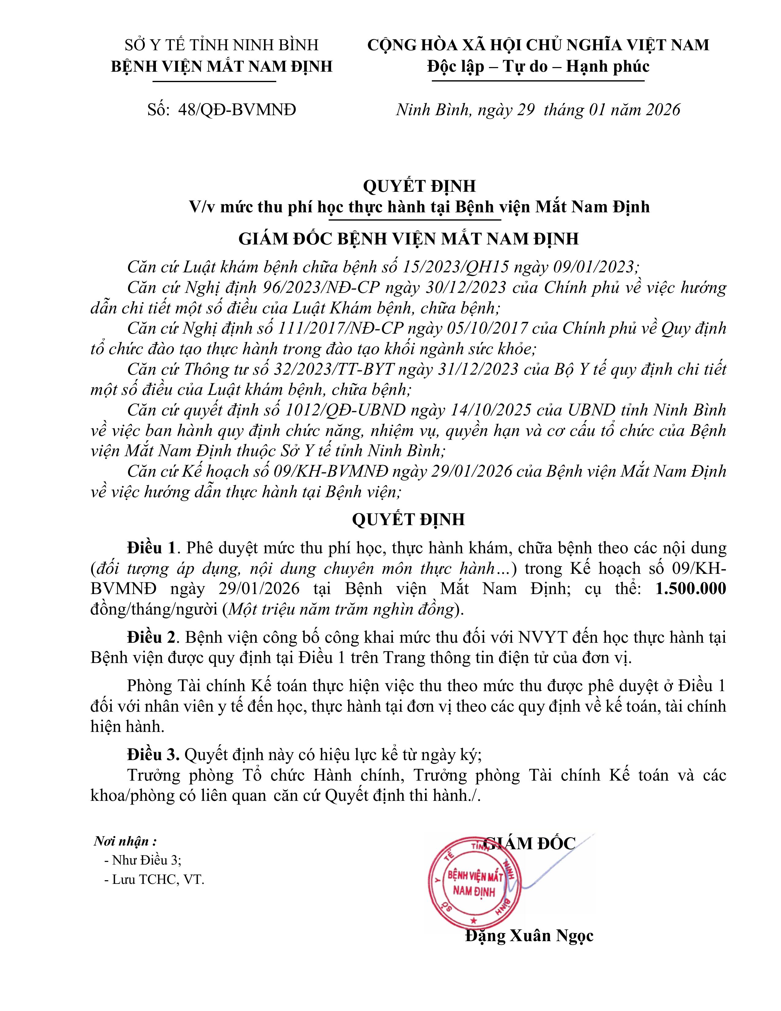 Quyết định phê duyệt mức thu phí học thực hành tại Bệnh viện Mắt Nam . . .