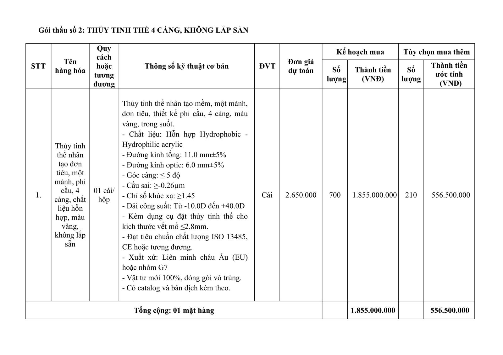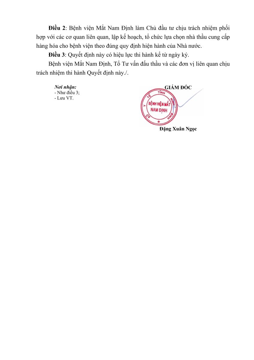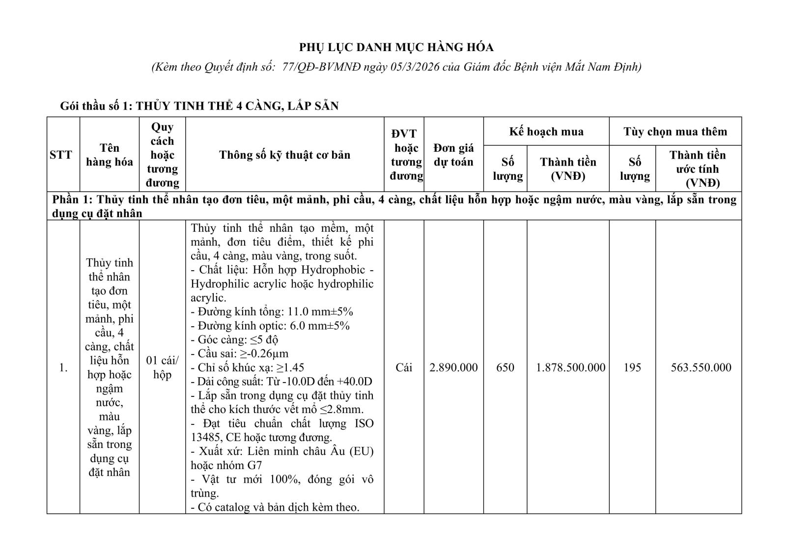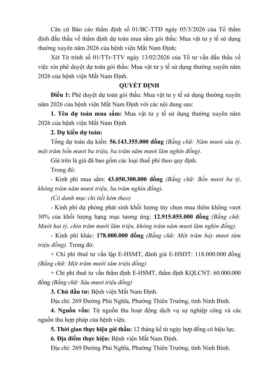 Quyết định Vv phê duyệt dự toán gói thầu: Mua vật tư y tế sử dụng thường xuyên năm 2026 của bệnh viện Mắt Nam Định