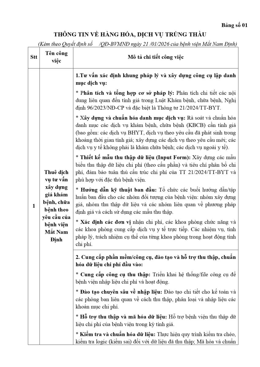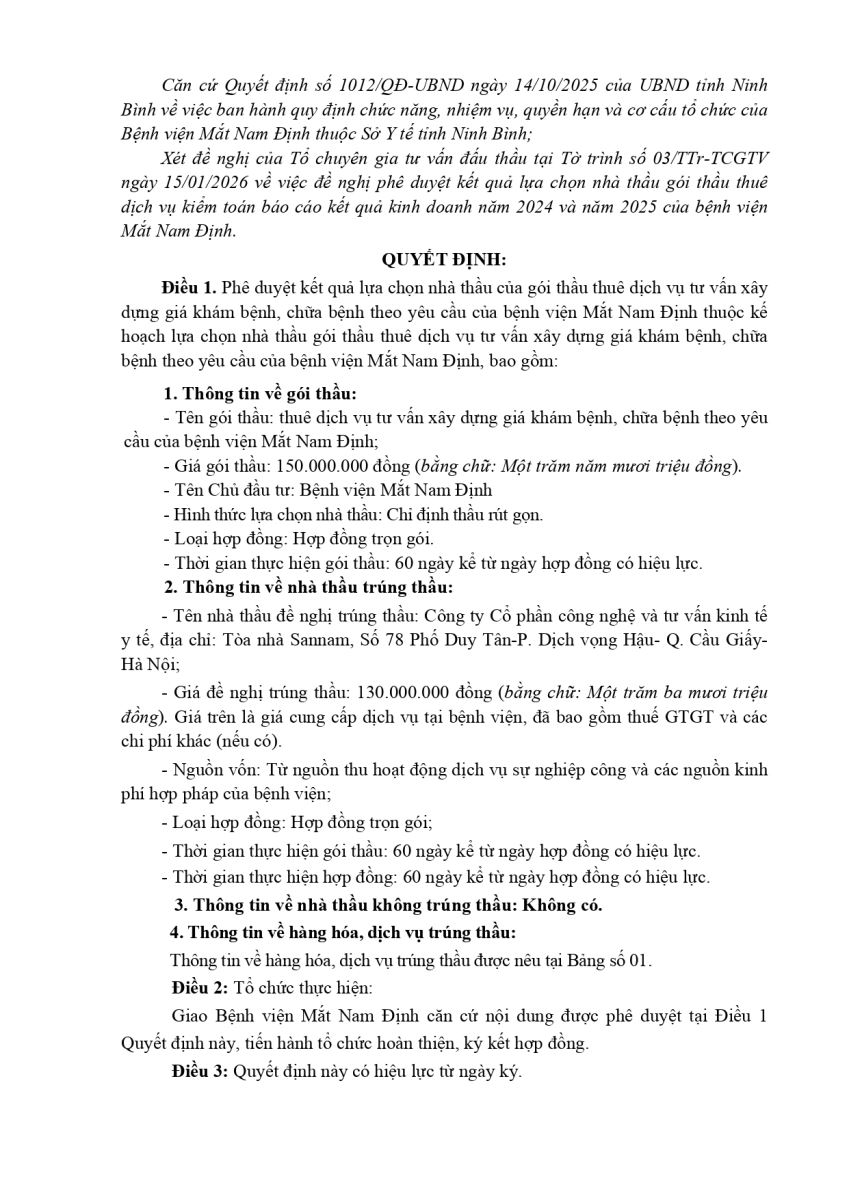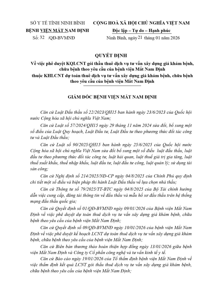 Quyết định vv phê duyệt KQLC gói thầu thuê dịch vụ tư vấn XD giá khám bệnh, chữa bệnh theo yêu cầu