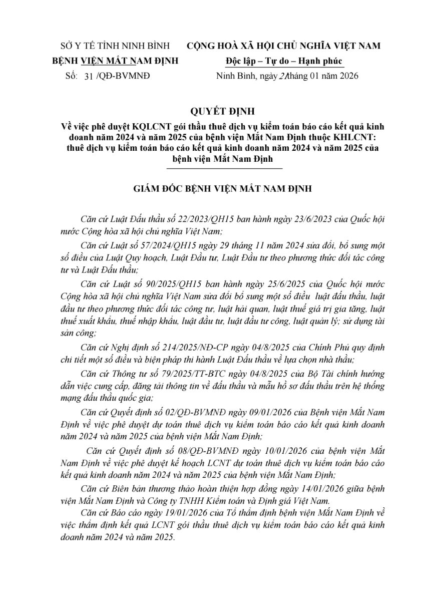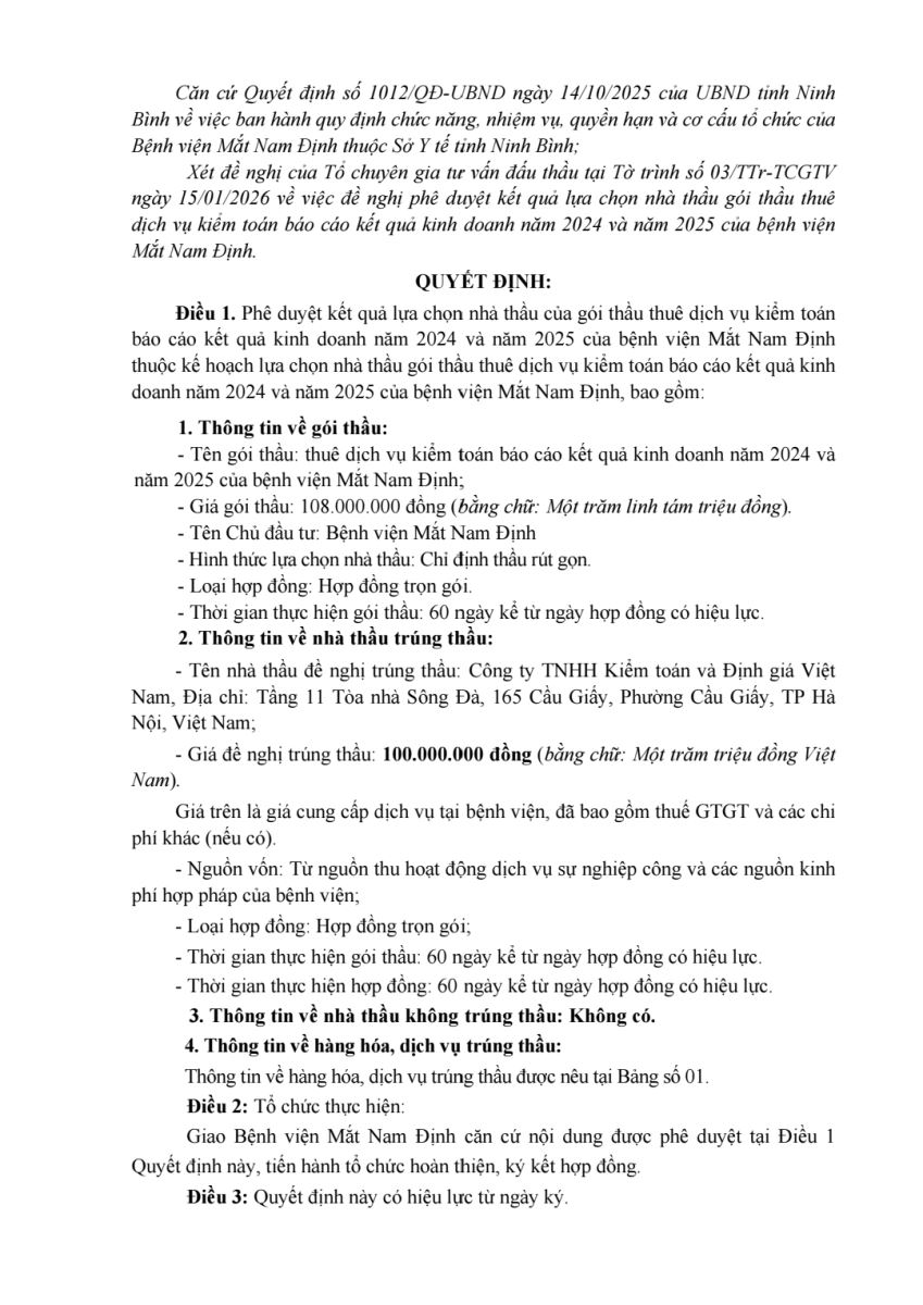 Quyết định vv Phê duyệt KQLCNT gói thầu thuê dịch vụ kiểm toán báo cáo kết quả kinh doanh năm 2024 và 2025