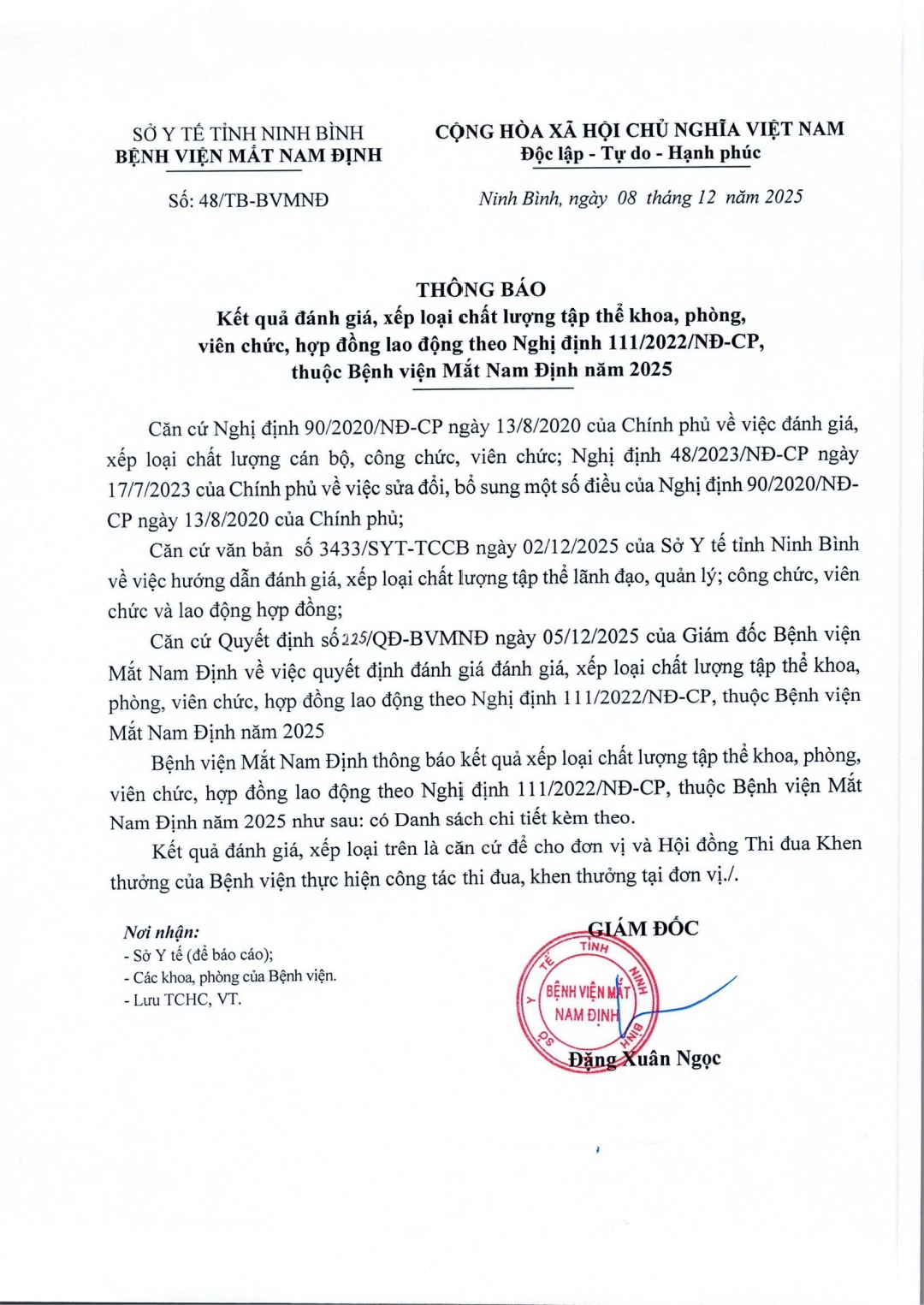 Thông báo kết quả đánh giá, xếp loại chất lượng tập thể khoa, phòng, . . .