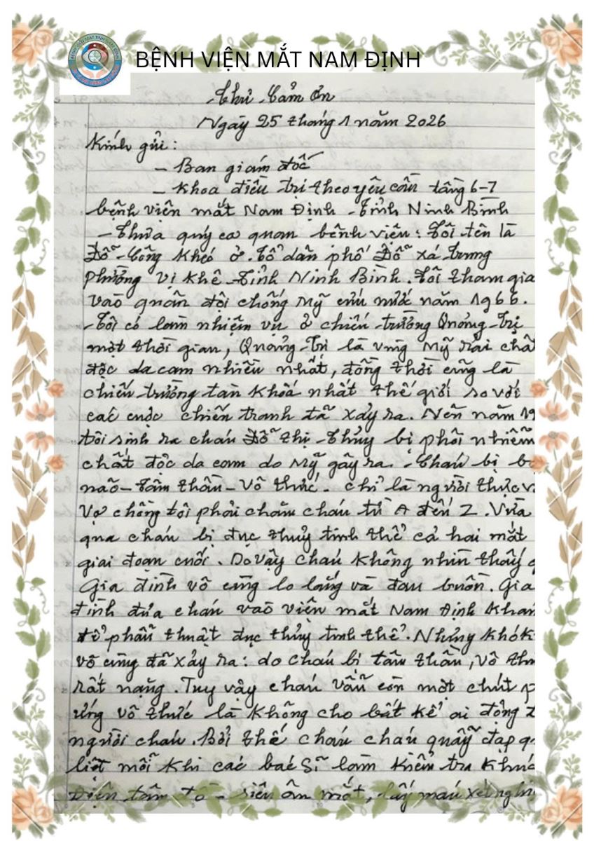 Trong số rất nhiều những lá thư tri ân gửi về Bệnh viện Mắt Nam Định thời gian gần đây, có một lá thư đặc biệt khiến tập thể y bác sĩ chúng tôi không khỏi bồi hồi và xúc động. Đó là dòng tâm sự đong đầy tình cảm của một bác cựu chiến binh, người đã dành cả tuổi thanh xuân trên chiến trường, nay lại tiếp tục hành trình cùng con gái – một nạn nhân chịu ảnh hưởng của chất độc da cam – đi tìm lại ánh sáng qua ca phẫu thuật thay thủy tinh thể.
