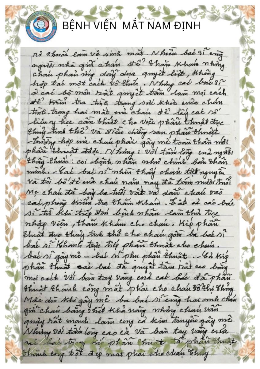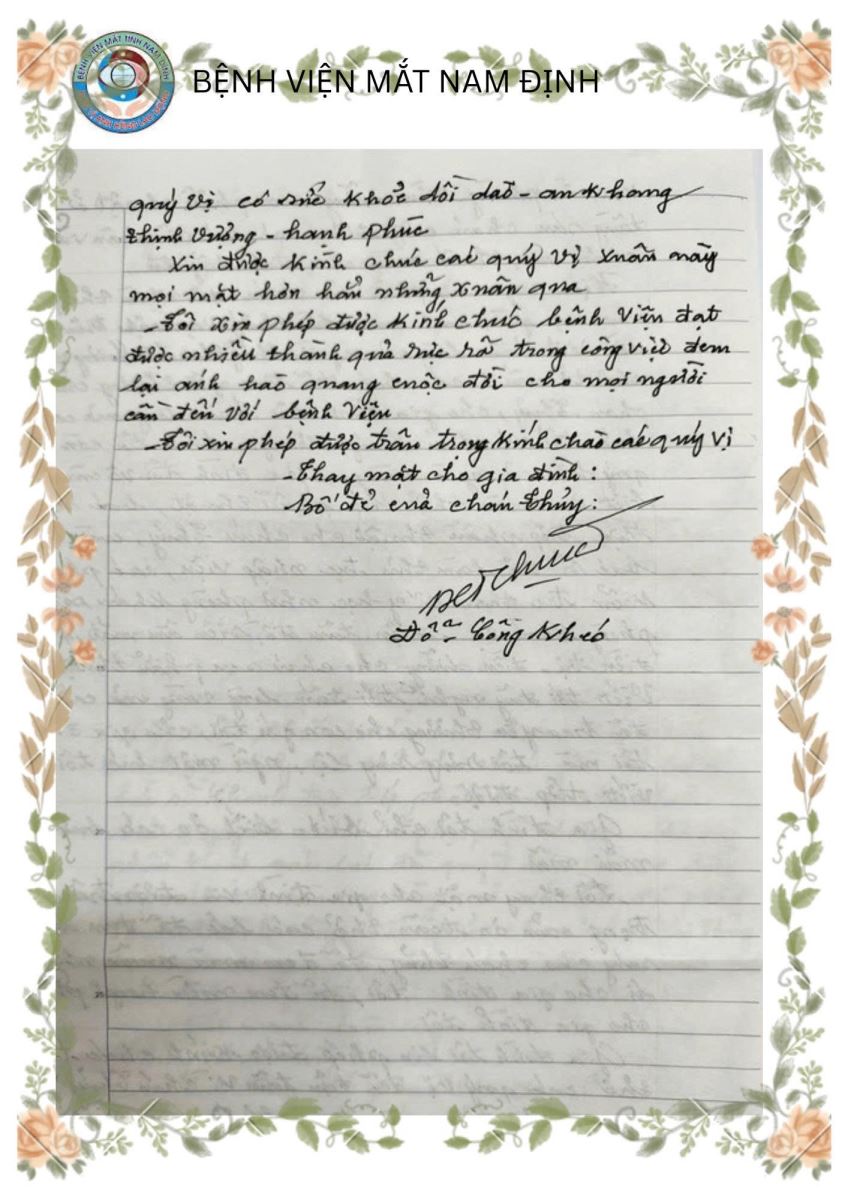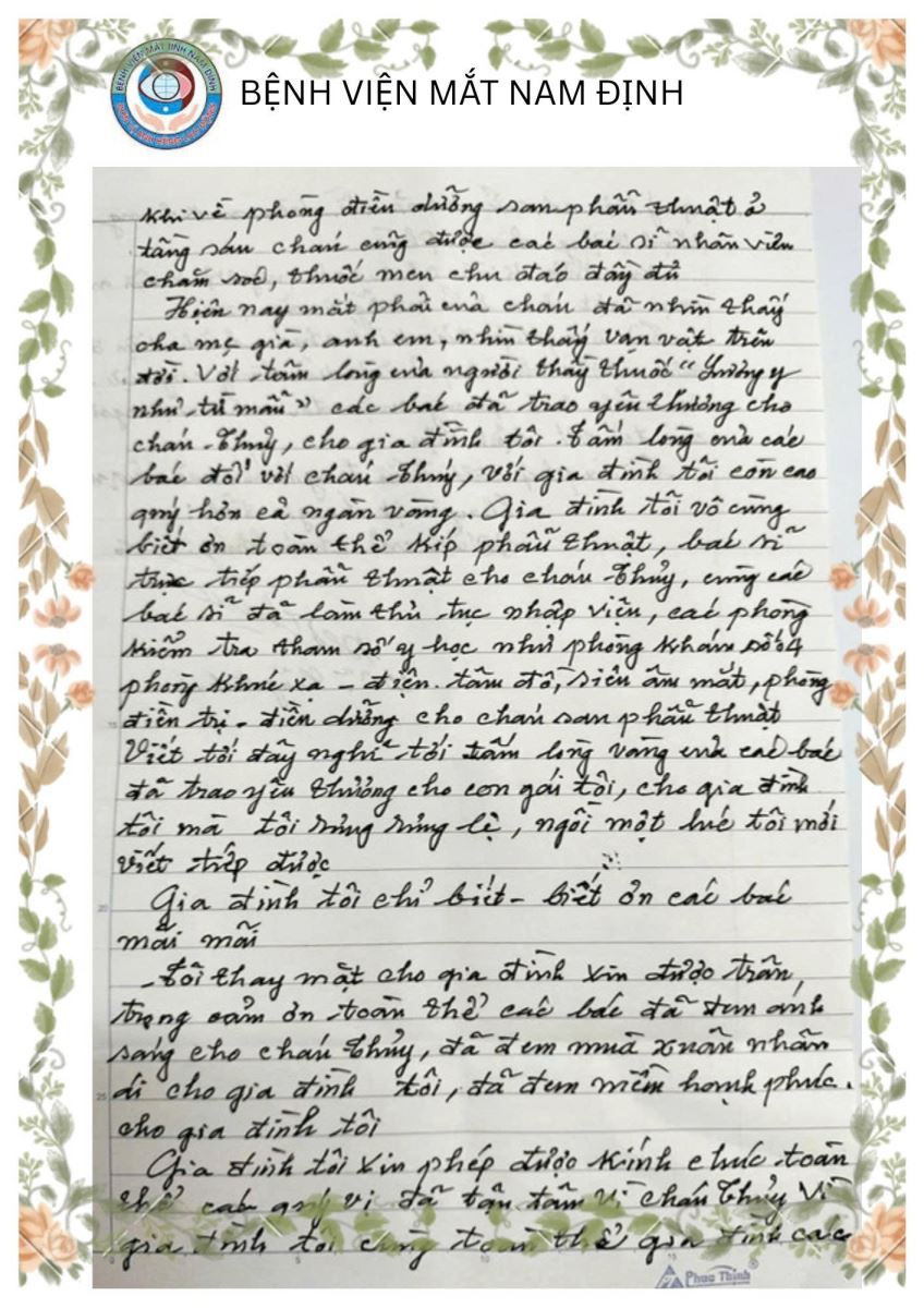 🏥 Bệnh viện Mắt Nam Định xin trân trọng cảm ơn bác và gia đình đã tin tưởng trao gửi niềm tin. Những lá thư như thế này chính là động lực để chúng tôi tiếp tục hành trình mang lại ánh sáng và hy vọng cho mọi người bệnh. Chúc bác và con gái luôn mạnh khỏe, hạnh phúc với đôi mắt sáng ngời!